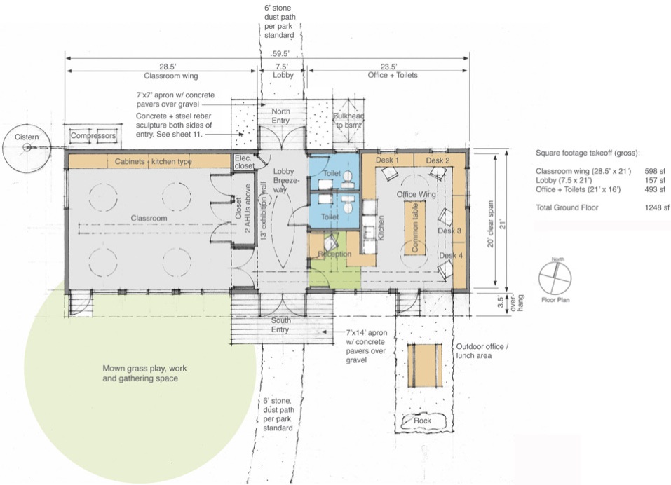 Designed as a simple shed-type structure, the building opens to the south for ample light and solar gain to warm the concrete floor in the cold season. Strategiaclly placed operable windows and a pass-through circulation breezeway and exhibition space helps to cool the building without HVAC in temperate weather. Composting toilets are open to park visitors and the toilet rooms are naturally daylit.