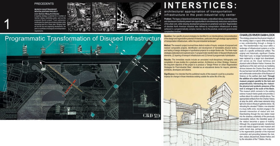 The legacy of abandoned industrial landscapes, underutilized railway marshalling yards and obsolescent docklands present opportunities to simultaneously restructure vast portions of the urban core, while reducing development pressures peripheral rural land. Regeneration of obsolete North American industrial sites defined by transportation infrastructure is rarely achieved in a programmatically complex manner, due to the practical, social and governmental complexities involved. This research focuses on interstices and indeterminate spaces within the morphological continuity of the central city—voids created by changes in the technologies of mobility and the loss of industrial production brought about by shifting capital. An interstice is “a space that intervenes between one thing and another,” where the restructuring of relationships between architecture, landscape and transportation infrastructure occurs. The pervasiveness and inevitability of urban interstices prompted investigation of the potentials inherent in those interstitial spaces, the disciplinary relationships involved, and the following research question: Can specific physical strategies be identified for an interdisciplinary (re)consideration of the design and regenerative potential of interstices, particularly through strategic architectural appropriations of transportation infrastructure, within the post-industrial landscape?