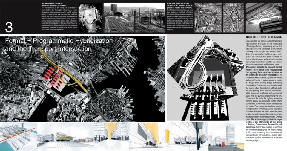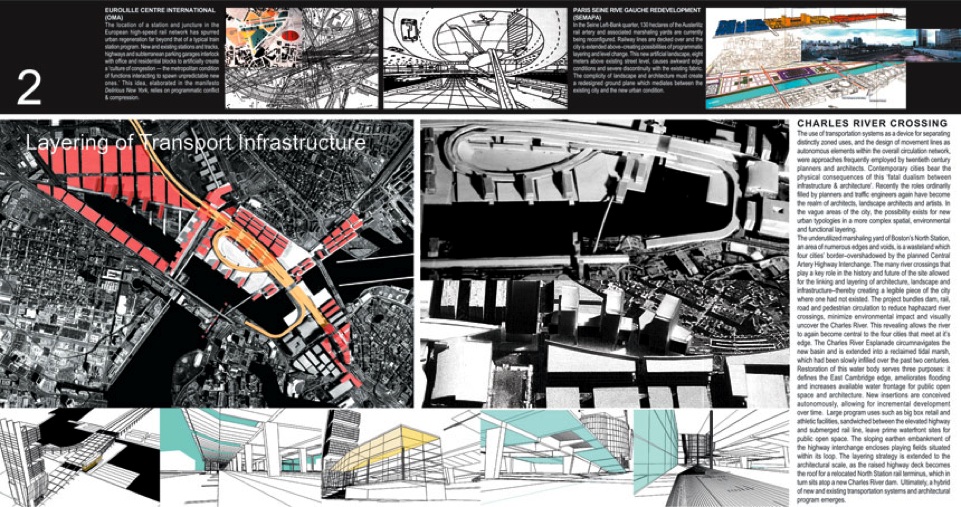 The research project involved three distinct modes of inquiry: analysis of proposed and built comparable projects, identification and development of translatable physical tactics, and testing of design strategies in hypothetical projects for a single Boston site. The three major strategies explored were (1) programmatic transformation of disused infrastructural elements, (2) layering of transport infrastructure and (3) formal and programmatic hybridization.