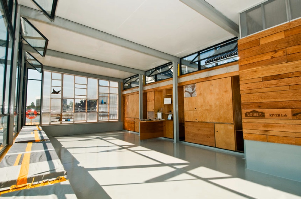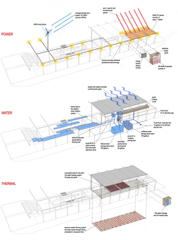 Photovoltaic panels and wind turbines provide power, an evacuated tube solar thermal array heats the classroom, and passive solar and day lighting concepts are used throughout. Rainwater is collected and filtered for non-potable use, and greywater is filtered in the onboard constructed wetland habitat. River water is manually pumped into native saltwater plant basins for testing and cleaning. Other sustainable building concepts include composting waste disposal and the use of recycled materials and sustainably harvested local hardwood. The renewable energy and water systems publicly exhibit a high quality of life while demonstrating energy independence with a substantial reduction in global pollution.