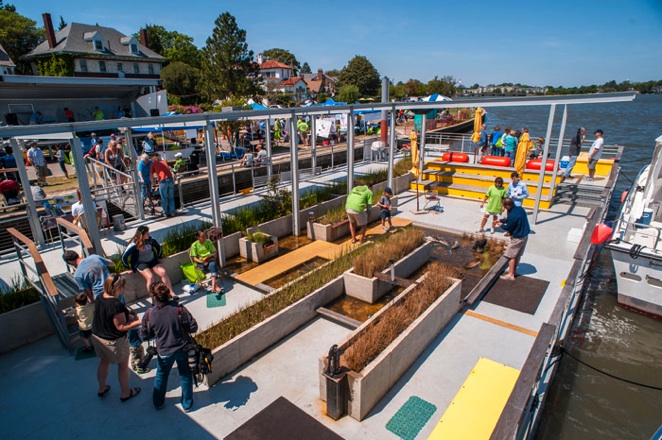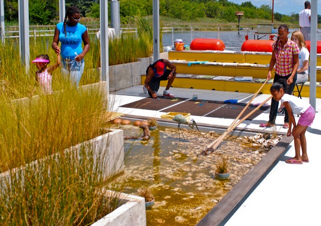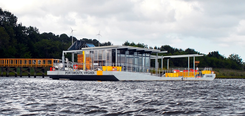 Christened on September 14, 2009, the Learning Barge has since won twelve major awards and completed eight seasons of successful educational programs reaching over 70,000 students. The Elizabeth River Project, in collaboration with several public partners, offers daily educational programs for K-12 school children and the public. Now visitors to the Learning Barge see, firsthand and in an interactive way, what the ordinarily abstract terms "remediation" and "natural processes" mean. The Learning Barge itself was designed as a didactic device reliant on natural systems - sun, wind, water, earth and biology - and built using primarily recycled materials. The Barge tells the story of the inextricable link between water and land, as well as the crucial balance between industrialized human activity and the environment on the Elizabeth River. Visits to the Barge may be scheduled via the ERP website.