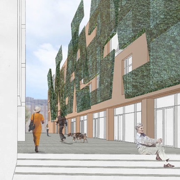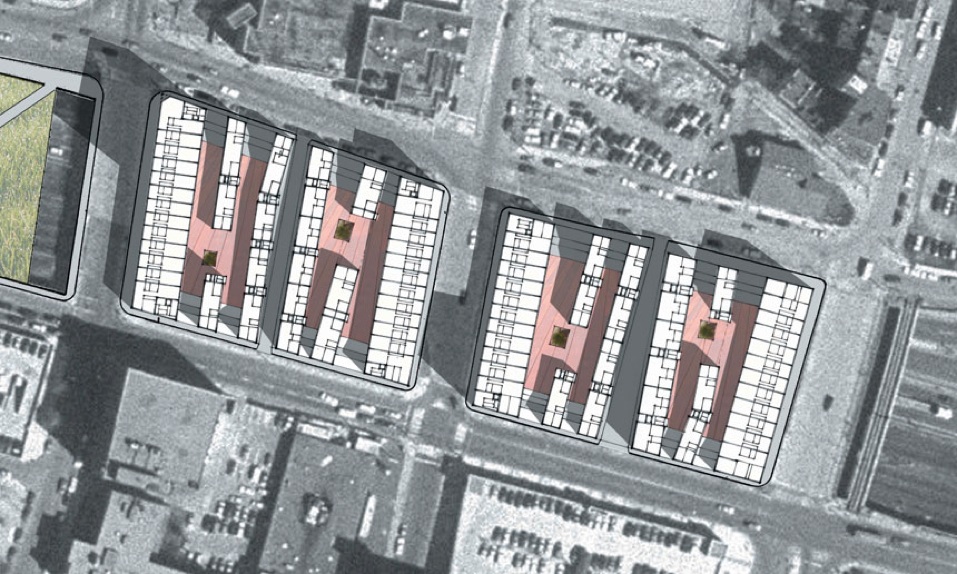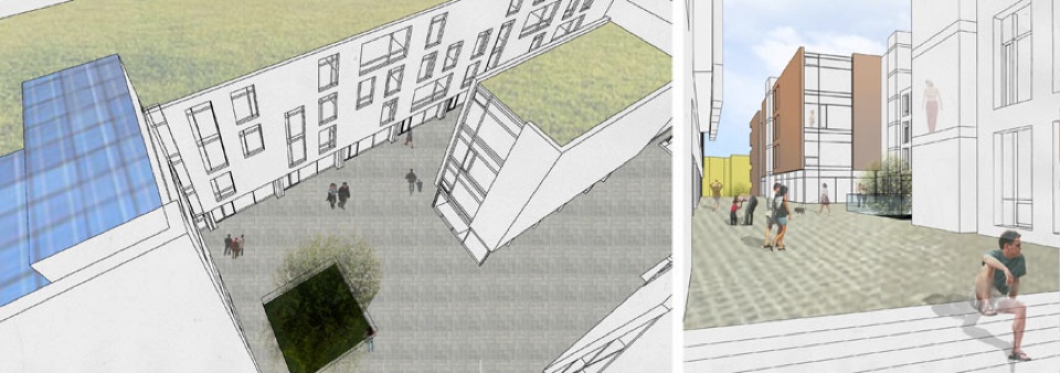 Two city blocks flanking Washington Street are subdivided into six mixed-use blocks by one new local street at grade and four pedestrian streets above two internal parking levels. These new streets and courts, edged by retail and small-scale commercial uses with residential above, will create active public spaces integral to the city structure. Rejecting the equation “green space = public space,” the streets themselves are the public space of the city. Buildings are aligned along the North-South axis so that all dwellings receive daily direct sunlight. Green roofs provide a recreational “backyard” for residents, and photovoltaic panels on the upper roofs take advantage of solar income.