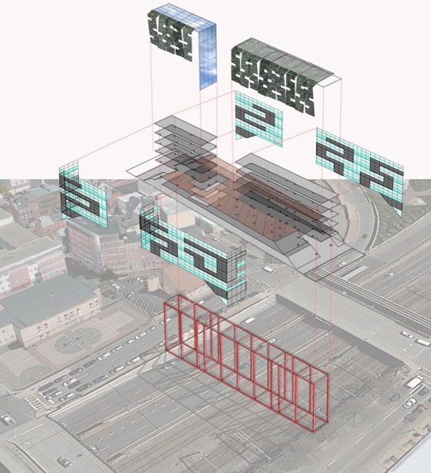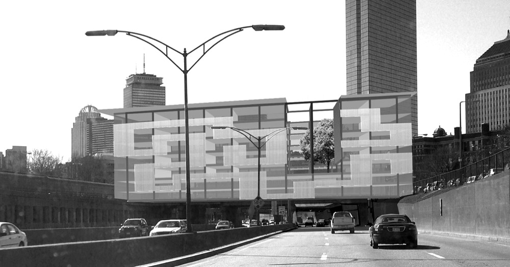 The structural idea for this scheme was driven by a desire to find a solution specfic to construction of rowhouses and more effective than the usual decking method of an anonymous thick concrete platform. The project spans above Boston’s Massachusetts Turnpike with a dense typology of sustainable, functionally mixed, mid-rise blocks. Our urban approach respects the existing layers, context and unseen history embedded in the site, and attempts to make history visible. A formal and spatial design strategy that integrally conceives of the public realm, urban structure and architectural typology results in a series of thin bridge buildings modeled on the traditional block scale and rowhouse typology of adjacent neighborhoods. The bridges link these neighborhoods, while emphasizing and recalling movement through the Neck on Washington Street.